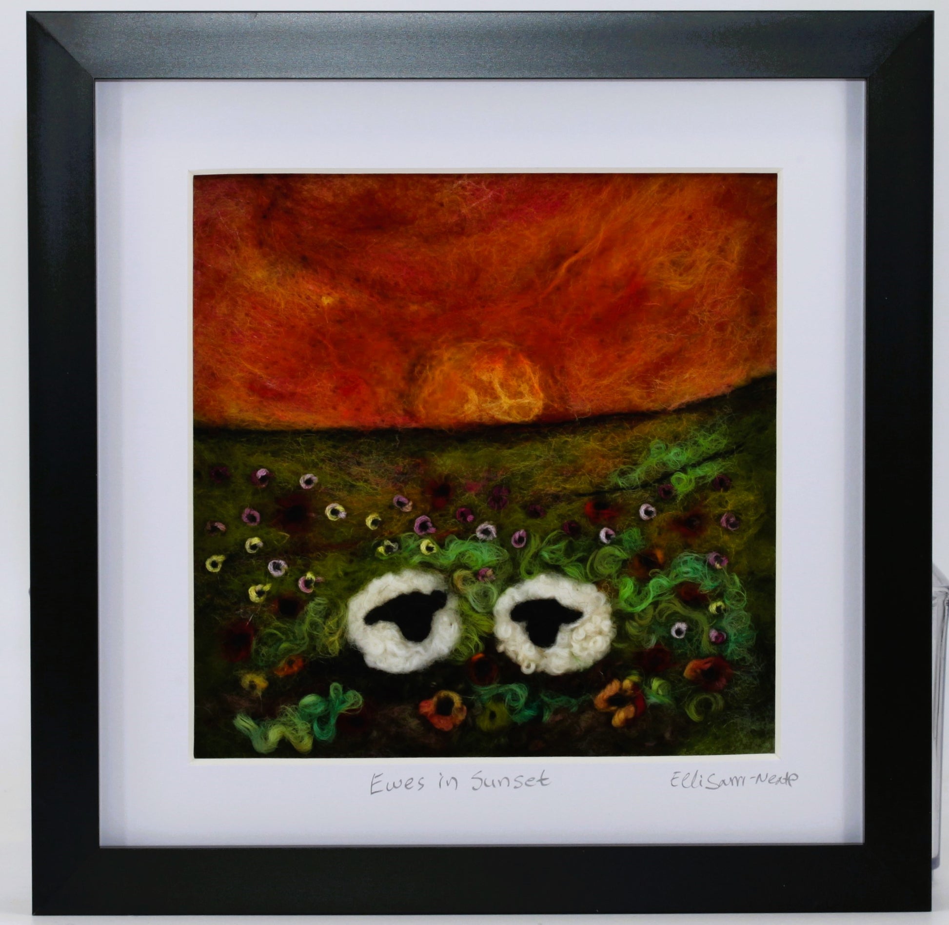 This small original painting captures the enchanting Yorkshire skies and the magical play of light during a summer sunset. "Ewes in Sunset" beautifully portrays the serene countryside landscape, showcasing the gentle sheep against the warm evening glow. Elegantly presented in a black shadow box frame measuring 23cm by 23cm approximately. This artwork brings a touch of pastoral tranquility and warmth to any space.