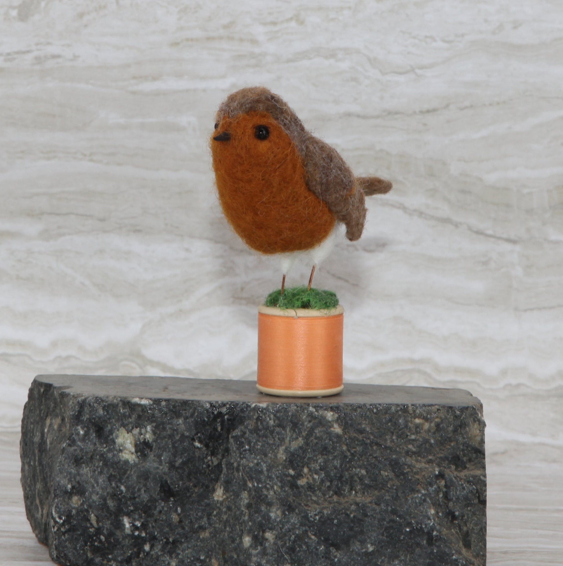 Felted robin attached on bobbin Robin, a beautiful, felted sculpture crafted from premium bergscaf, corriedale, and merino wool. This captivating piece features authentic details including a handcrafted clay beak, glass eyes, and wire legs.